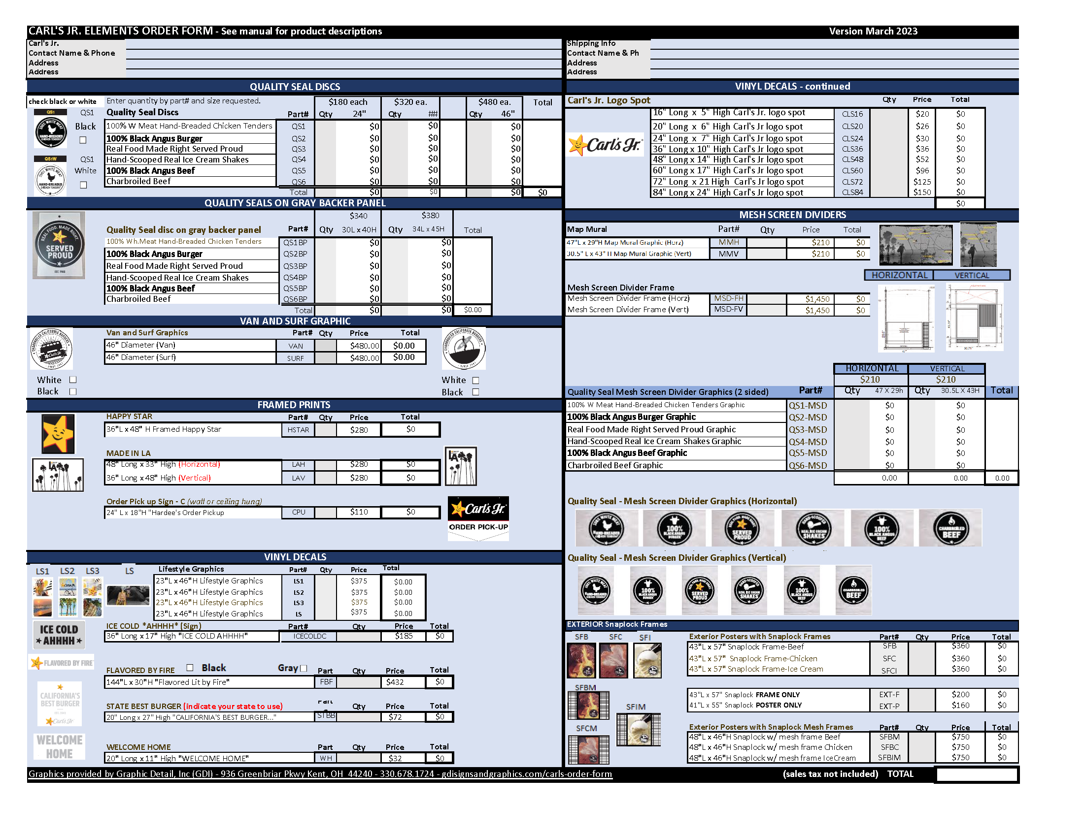 Click here to view the Carl’s Jr. catalog, then click on the image below to download a fillable excel spread sheet to order the items needed for your store.